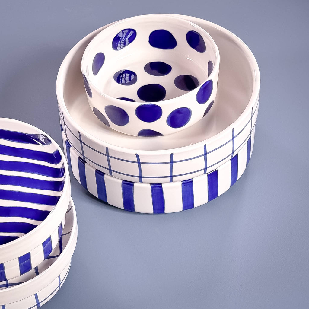 Dieses Geschirr nimmt dich zu einem Kurzurlaub nach Italien mit. Bei der handwerklich hergestellten Keramik ist jedes Teil ein Unikat. Jeder Streifen und jeder Punkt sowie die Glasur wurden von Hand aufgetragen.