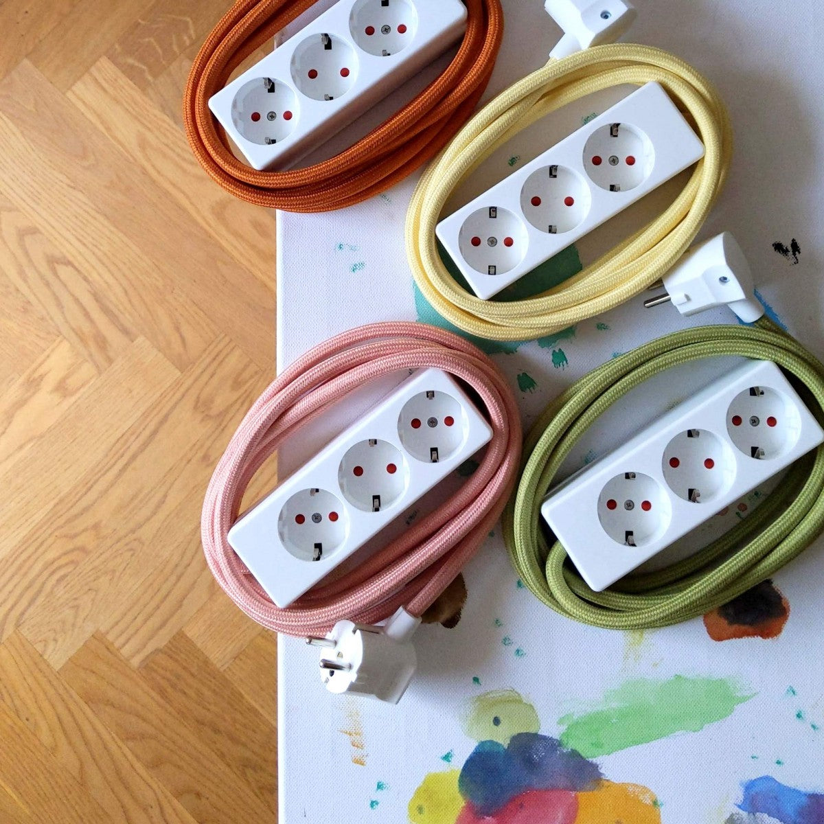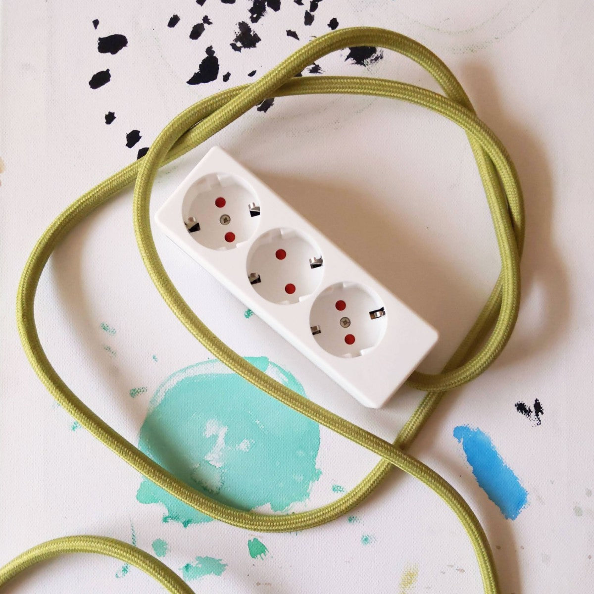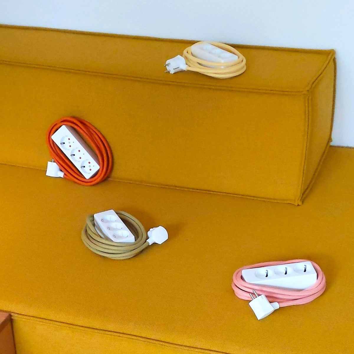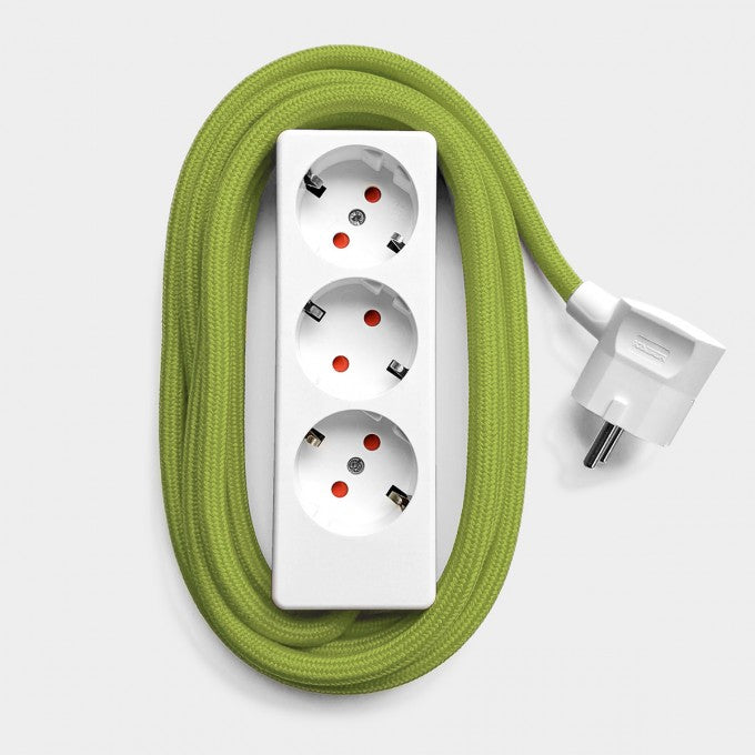 Weiße Steckerleiste mit farbigem Textilkabel. Die original Stromer-Steckerleiste ist ein schickes Büroaccessoire. Drei kindersichere Steckplätze in schlichtem weißen Kunststoffgehäuse mit farbigem Textilkabel. Kabellänge ca. 3m.